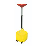 18 gallon capacity. Rugged polyethylene is dent resistant, rust and leak proof. Large 15" plastic funnel with built in strainer. Container is translucent so you can see the oil level. Four large 4" wheels for easy mobility. Overall height from 45" to 71-1/2". Dolly can also be used with 120 lb. drums.
