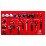 Heavy duty 3/4" birch (Cabinet Grade ) plywood covered by an oil resistant expanded PVC laminate. Board measures 23.5" high x 42" wide. **Red board with white outline of the following tools: